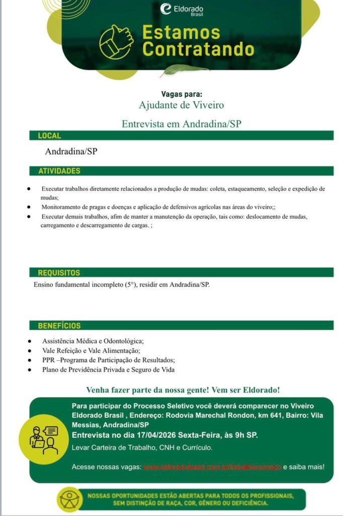 Empresa abre vagas para ajudante de viveiro em Andradina Seleção da Eldorado Brasil acontece nesta sexta-feira (17) com contratação para atuação no município A Eldorado Brasil está com oportunidades de emprego abertas para o cargo de ajudante de viveiro em Andradina. A seleção será realizada presencialmente nesta sexta-feira, dia 17 de abril de 2026. De […]