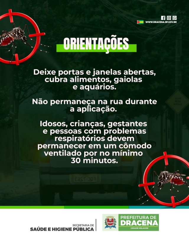 Durante os dias de aplicação, os agentes de controle de vetores realizarão visitas domiciliares nas áreas atendidas. Orientações à População para garantir a eficácia da nebulização e a segurança dos moradores, é necessário adotar algumas medidas durante a passagem do veículo: Manter portas e janelas abertas; Cobrir alimentos, gaiolas e aquários; Evitar permanecer na rua no momento da aplicação; Idosos, crianças, gestantes e pessoas com problemas respiratórios devem permanecer em um cômodo ventilado e fechado por, no mínimo, 30 minutos.